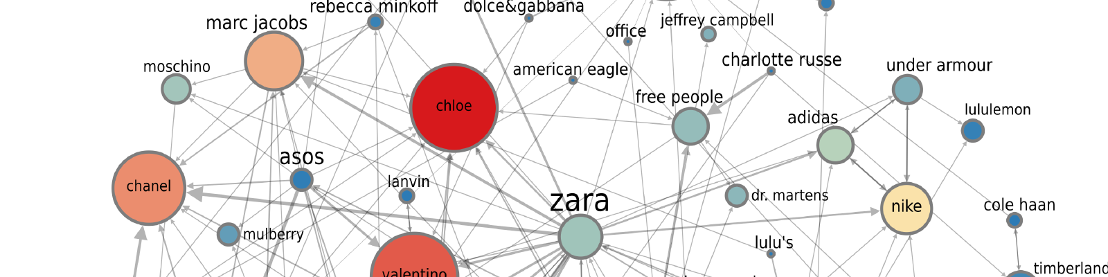 brands. Red-orange nodes have high authority, yellow intermediate, and