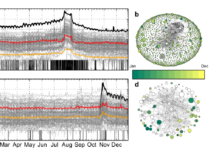 times when new linked articles are created (see Methods). (b), Network of